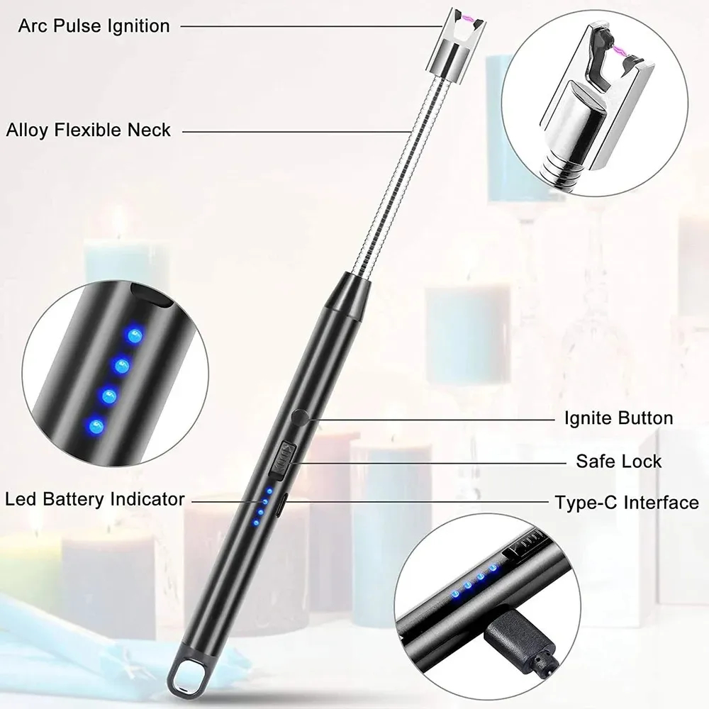 • 𝑭𝑳𝑬𝑿𝑰𝑩𝑳𝑬 𝑵𝑬𝑪𝑲 𝑫𝑬𝑺𝑰𝑮𝑵 & 𝑳𝑬𝑫 𝑩𝑨𝑻𝑻𝑬𝑹𝒀 𝑰𝑵𝑫𝑰𝑪𝑨𝑻𝑶𝑹 : ARC lighter has a long flexible neck, it can be easily rotated 360°for different lighting needs. What’s more, our candle lighter rechargeable can display real-time battery power. 4 LED lights on, it is fully charged.